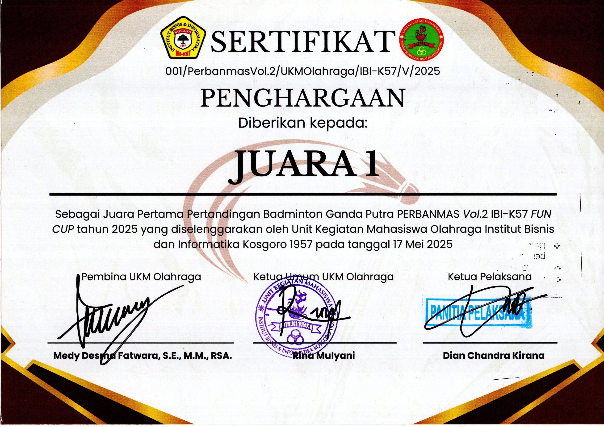DIKA, DIKA (2025) Juara 1 PERBANMAS Vol.2 IBI-K57 Fun Cup 2025. Direktorat Kemahasiswaan dan Alumni.